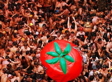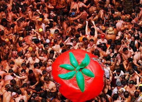 Every year (Late August), the town of Buñol near Valencia hosts La Tomatina, where thousands of people hurl tomatoes at each other for fun creating a spectacular and messy festival that attracts visitors from around the world